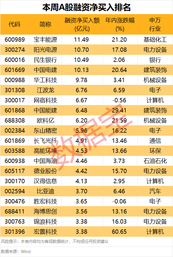 个股方面。本周27股融资净买入额在3亿元以上。宝丰能源、阳光电源、民生银行、中国电建净买入额超过10亿元;其中,宝丰能源净买入额最高,为11.49亿元。