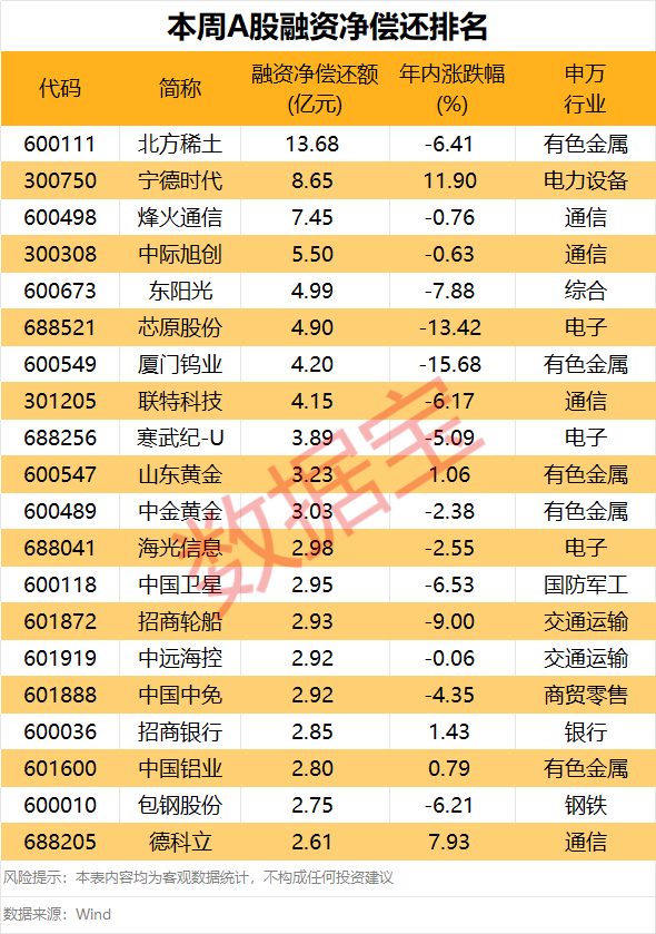 80股融资净偿还额超过1亿元。北方稀土、宁德时代、烽火通信、中际旭创排名前四,融资净偿还额依次为13.68亿元、8.65亿元、7.45亿元、5.5亿元。