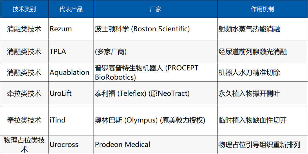 牵拉类技术(UroLift、iTind),用永久或临时植入物把侧叶撑开,美敦力的iTind虽然也是临时植入,但作用机制是缺血性切开,本质上还是组织改造。
