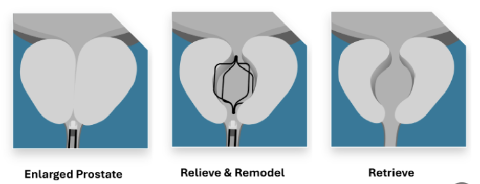 通过柔性膀胱镜置入镍钛合金编织的膨胀体,在梗阻的前列腺尿道段撑开通道,然后留置下来。六个月的时间里,被撑开的组织逐渐适应这个通道形态,完成所谓的“组织重塑”。